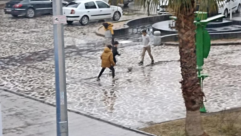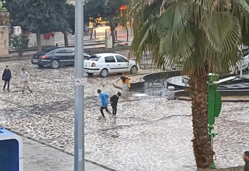 Kızıltepe ilçesinde, çocukların yağmur suyuyla dolan alanı temizleyerek top oynadıkları anlar cep telefonuyla görüntülendi.