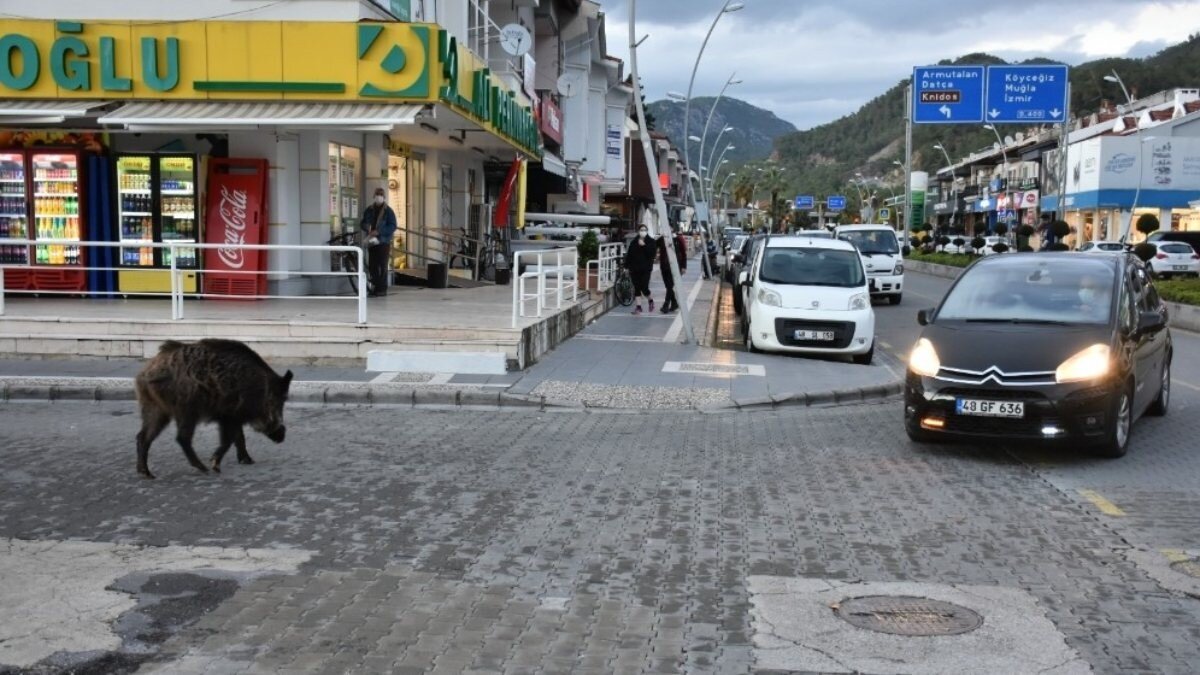 Muğla’nın Marmaris ilçesinde eskiden geceleri ormanlık alanların yakınlarında bulunan otellerin çevresine inen domuzlar, şimdi sürüler halinde şehir turu yapıyor.