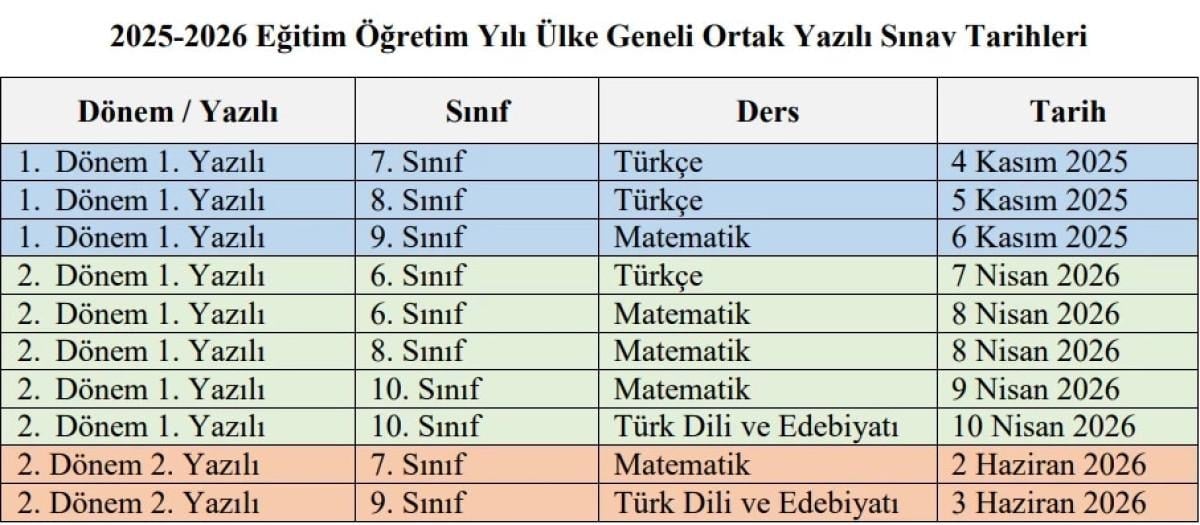 2025-2026 eğitim ve öğretim yılına ilişkin ortak sınav takvimi ise şu şekilde: