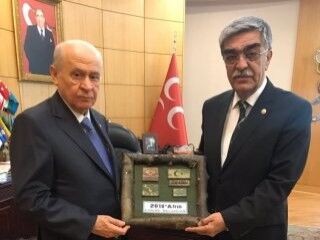 Çerçevesi zeytin dalından yapılan ve üzerinde jandarma personeline ait bröve ile rütbe armalarının yer aldığı, "2018-Afrin Lidere Selamlar" yazılı tablo, MHP Hatay Milletvekili Mehmet Necmettin Ahrazoğlu tarafından Bahçeli'ye takdim edildi.