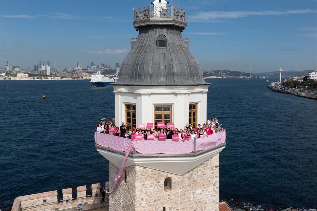 Üsküdar'daki Kız Kulesi, 'Meme Kanseri Farkındalık Ayı' etkinlikleri çerçevesinde pembe kurdeleyle süslenerek meme kanserinde erken teşhisin önemi vurgulandı.