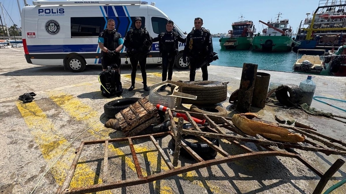Etkinlik kapsamında Silifke ilçesindeki Taşucu Limanı’nda dalış yapan dalgıç polisler, deniz dibinden araç lastikleri, cam ve plastik şişeler, çöp kovası, sandalye, bisiklet, bariyer, damacana ve çeşitli atıklardan oluşan çok sayıda çevresel kalıntıyı su yüzeyine çıkardı.