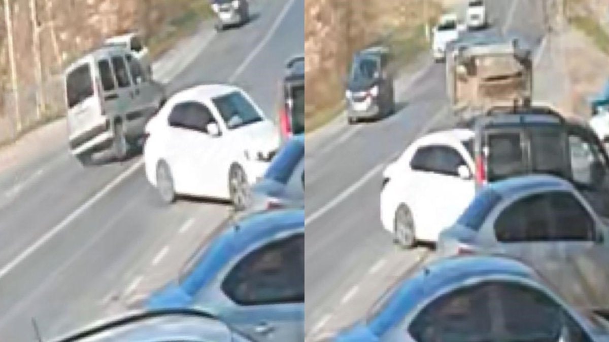 Görüntülerde hafif ticari aracın yoldan çıkıp devrilme anı yer aldı.