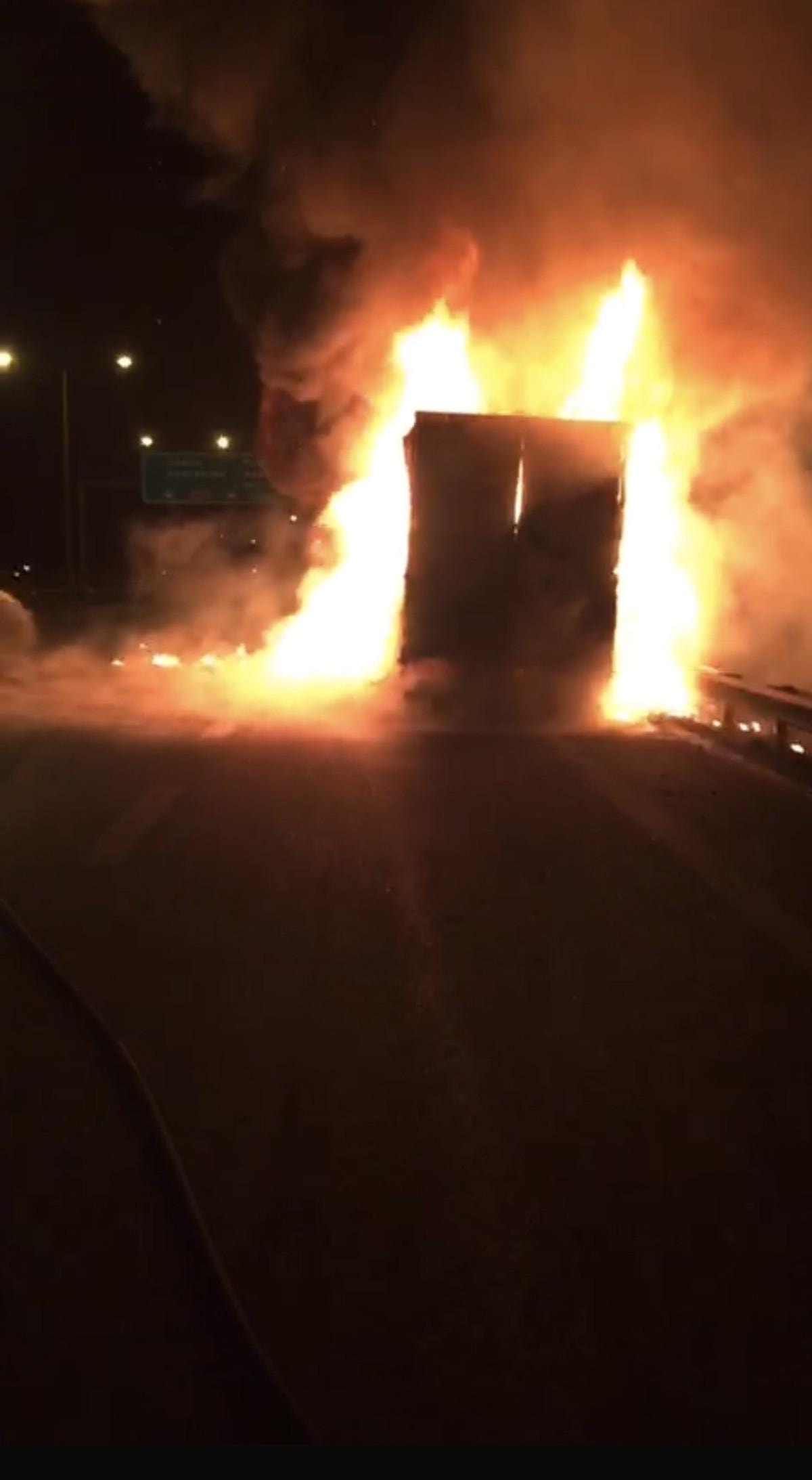 Tarsus-Adana istikameti Çamtepe kavşağı civarında U.Y.'nin kullandığı kumaş ve banyo malzemesi yüklü tırın 01 COV 61 plakalı dorsesinin lastik bölümünde yangın çıktı.