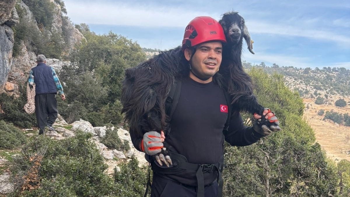 Mersin'in Erdemli ilçesine bağlı Karahıdırlı Mahallesi’nde, hayvancılıkla uğraşan Ali Karabulut’a ait sürüden ayrılan iki keçi, sarp ve ulaşılması güç kayalıklara çıkarak mahsur kaldı.