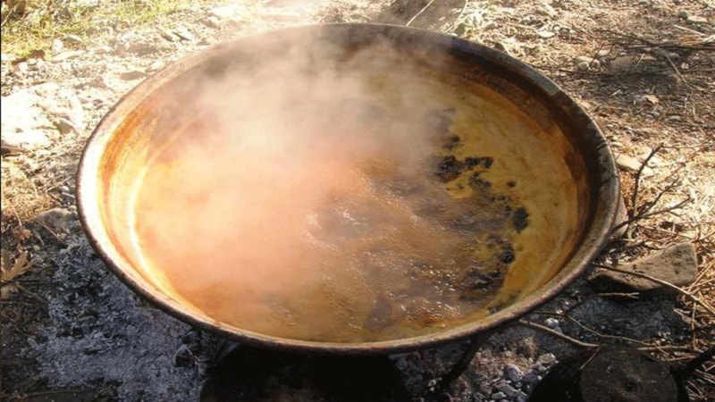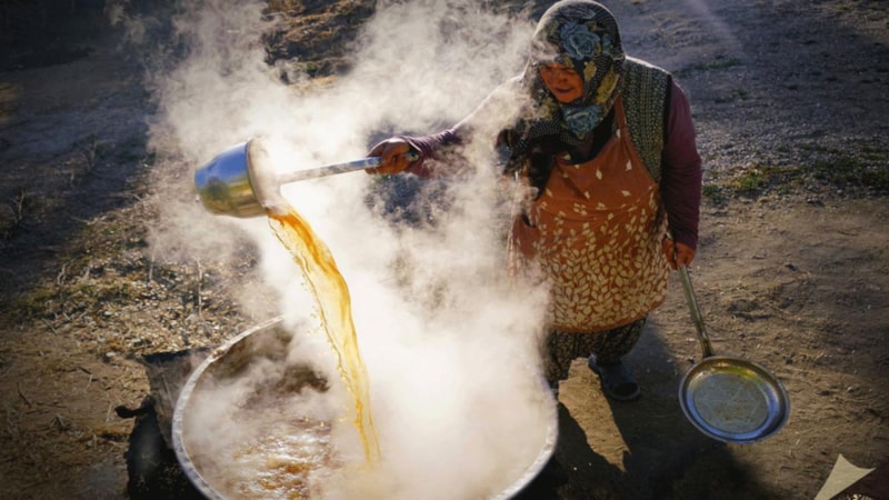 "Üzümleri iyice yıkadıktan sonra çuvallara koyuyoruz. Erkekler çuvalların içindeki üzümleri ayaklarıyla ezerek üzüm suyunu çıkarıyor. Elde edilen şıra, büyük kazanlarda saatlerce kaynatılarak pekmeze dönüştürülüyor. Daha sonra şişelere doldurup güneş görmeyen yerlerde kış için saklıyoruz."