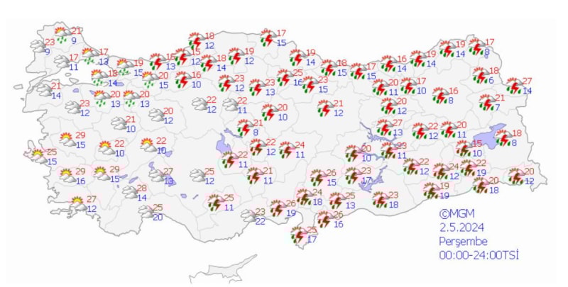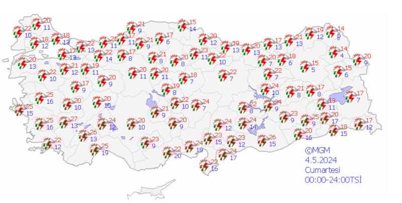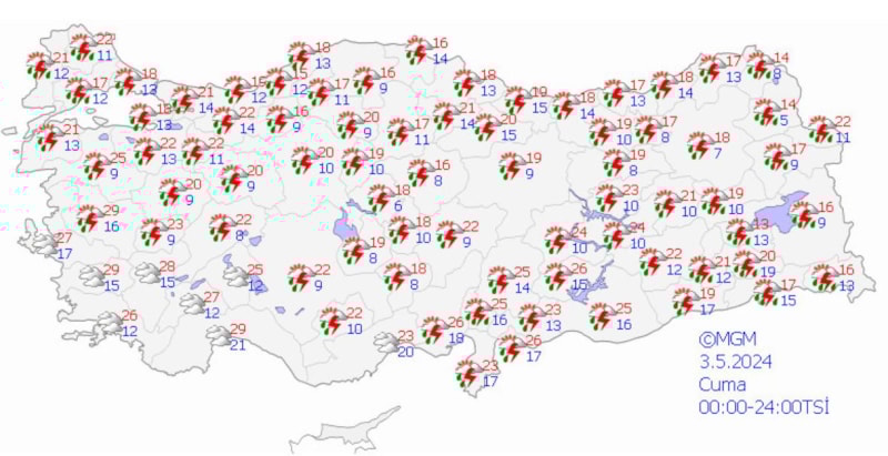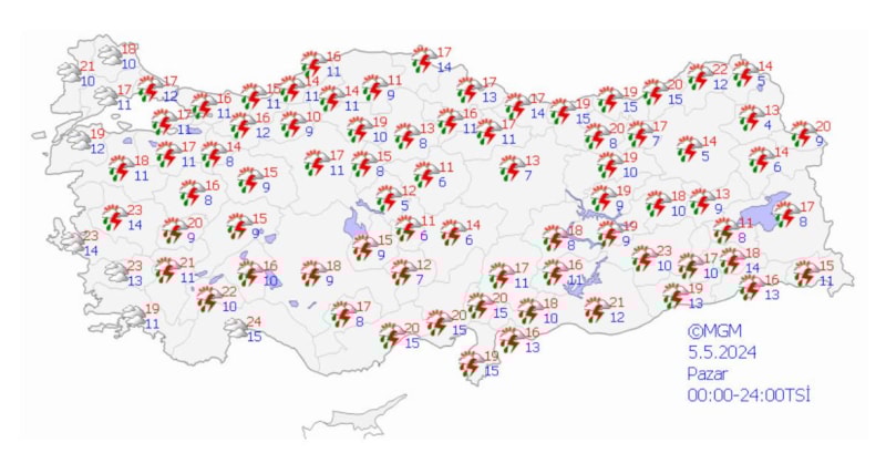 Yağışların, Doğu Akdeniz, İç Anadolu (Eskişehir hariç), Batı Karadeniz (Sinop hariç) ile Çorum, Amasya, Gaziantep ve Kilis çevrelerinde yer yer kuvvetli olması bekleniyor.