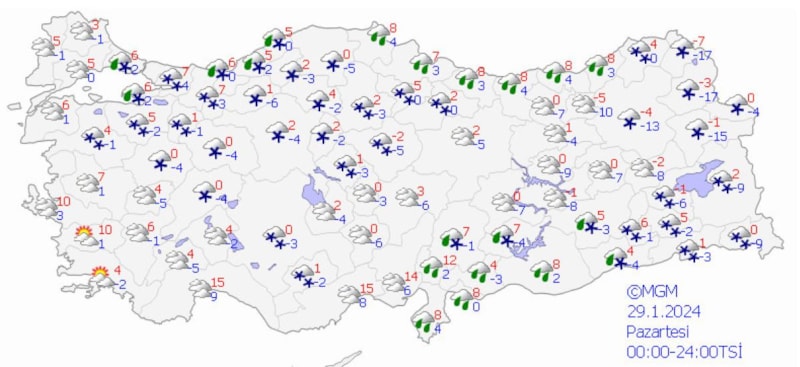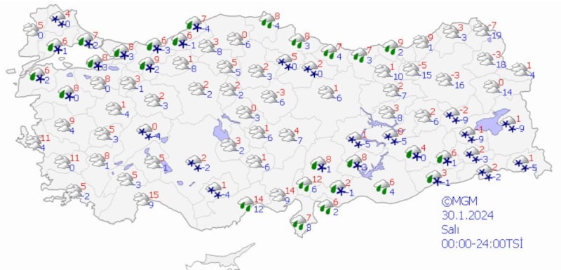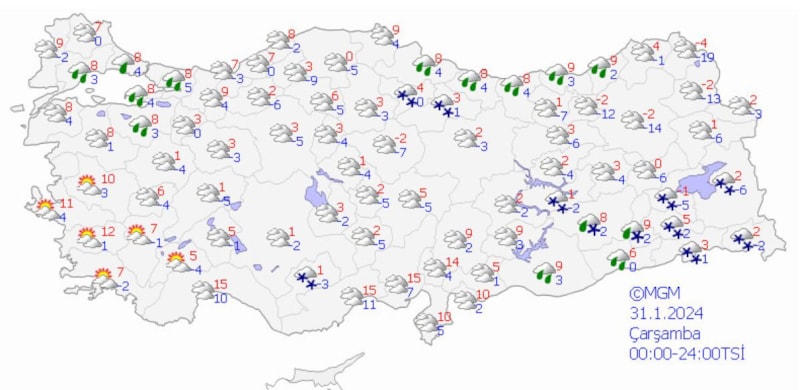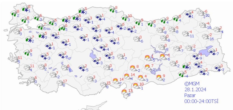 Kıyılarda yağmur ve sağanak, iç kesimlerde karla karışık yağmur ve kar şeklinde olması beklenen yağışların Doğu Karadeniz kıyı illeri ile Bolu, Zonguldak, Bartın ve Düzce'de, Güneydoğu Anadolu'nun doğusu, Doğu Anadolu'nun güneydoğusu ile Bingöl ve Muş çevrelerinde kuvvetli olması bekleniyor. Gece ve sabah saatlerinde pus ve yer yer sis ile birlikte iç ve doğu bölgelerde buzlanma ve don olayı görüleceği öngörülüyor.