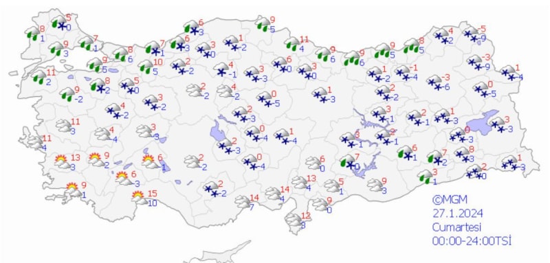 Bugün yağmur şeklinde görülecek yağışların Pazar günü karla karışık yağmur, akşam saatlerinden itibaren kar şeklinde etkili olması bekleniyor. Pazartesi öğle saatlerine kadar ise yerel kuvvetli kar yağışı geçişlerinin yaşanabileceği öngörülüyor.