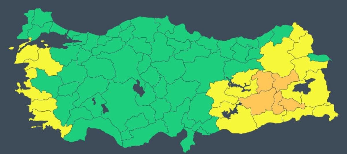 Sarı ve turuncu kod ile uyarılan şehirler şu şekilde: