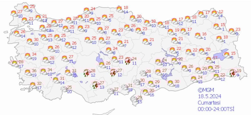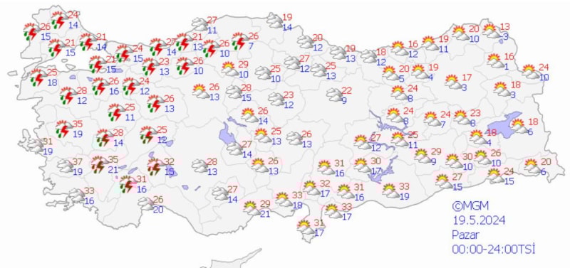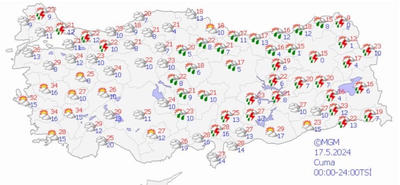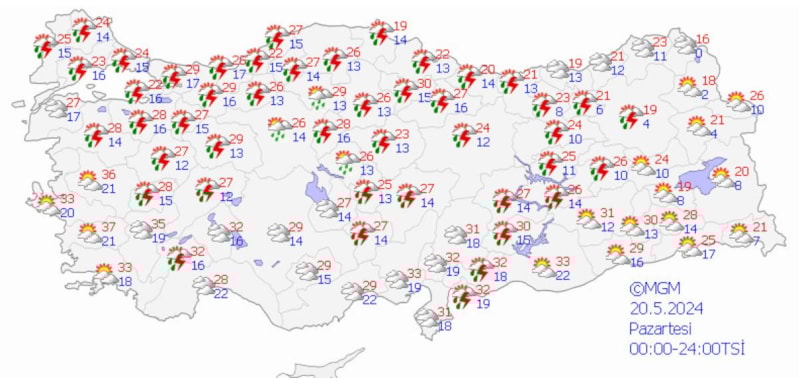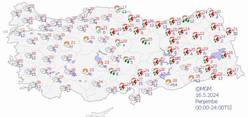 Meteoroloji Genel Müdürlüğü tarafından yapılan son değerlendirmelere göre; ülkemiz genelinin parçalı yer yer çok bulutlu, Doğu Akdeniz’in iç kesimleri, İç Anadolu’nun güney ve doğusu, Orta ve Doğu Karadeniz, Doğu Anadolu, Kastamonu, Hatay ve Siirt çevreleri ile Batı ve Orta Akdeniz’in Toroslar kesiminin yerel olmak üzere sağanak ve gök gürültülü sağanak yağışlı, Doğu Anadolu'nun kuzeydoğusunun yüksek kesimlerinin yer yer karla karışık yağmur ve kar yağışlı geçeceği tahmin ediliyor.