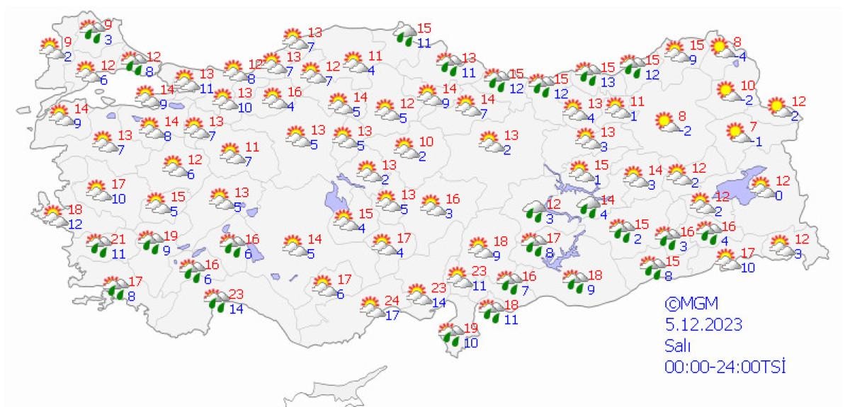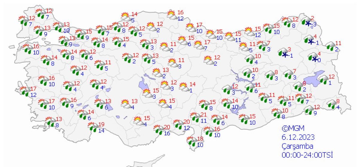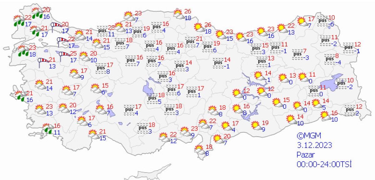 Diğer yerlerin ise az bulutlu ve açık geçeceği tahmin ediliyor. Gece ve sabah saatlerinde iç ve doğu bölgelerde yer yer pus ve sis bekleniyor.