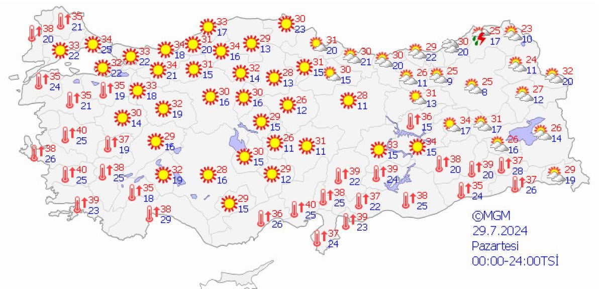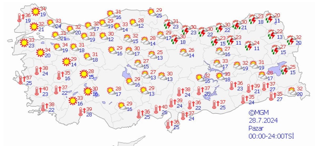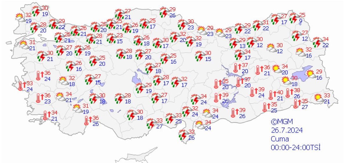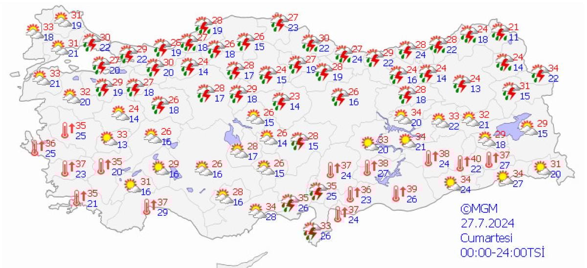 Yağışların; Batı Karadeniz, İç Anadolu’nun kuzeyi, İstanbul, Kocaeli, Sakarya, Denizli, Afyonkarahisar, Uşak, Denizli'nin doğusu, Adana ve Mersin’in kuzeyi ile Kahramanmaraş’ın batı ilçeleri yerel kuvvetli, Batı Karadeniz kıyılarında yer yer çok kuvvetli ve şiddetli olması bekleniyor.
