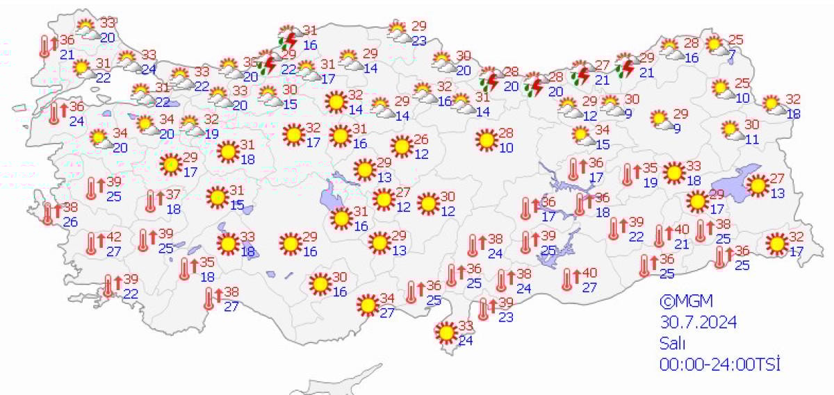 Buna göre Marmara, İç Ege, Akdeniz (Antalya kıyıları hariç), İç Anadolu, Karadeniz (Ordu ve Giresun hariç), ile Erzincan, Kars, Ardahan ve Iğdır çevrelerinin yerel sağanak ve gök gürültülü sağanak yağışlı geçeceği tahmin ediliyor.