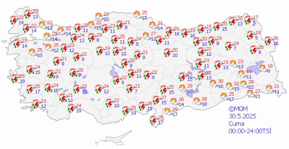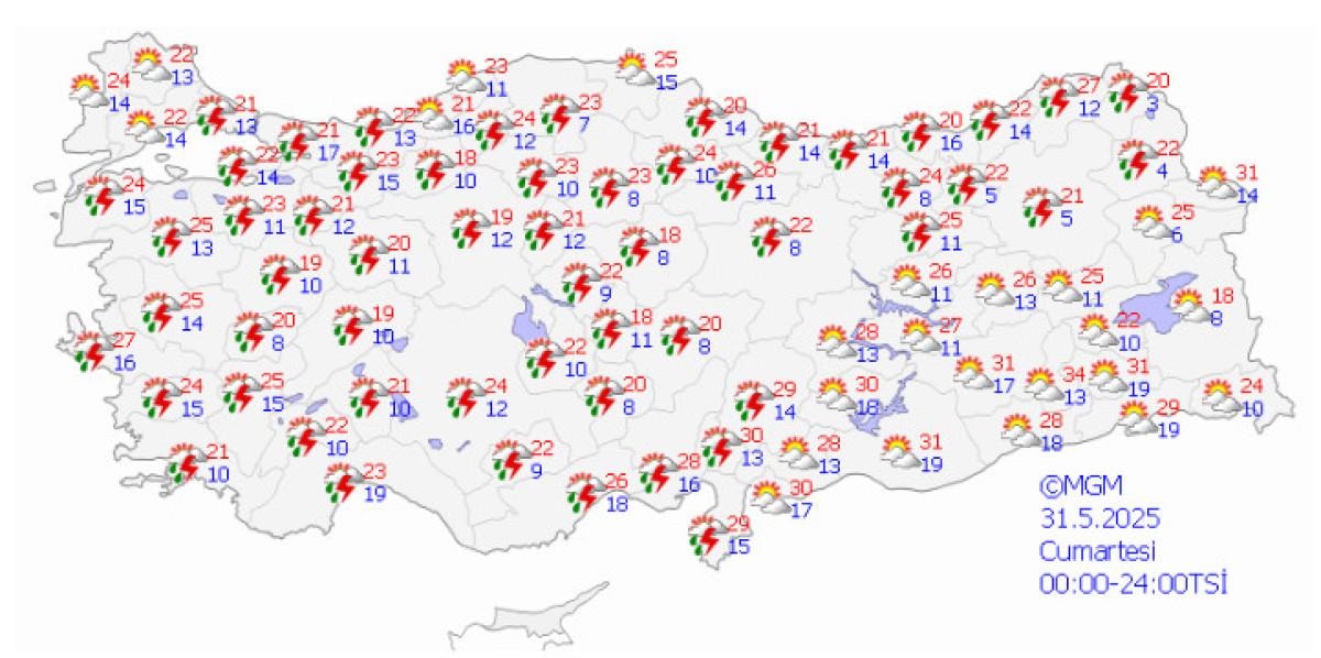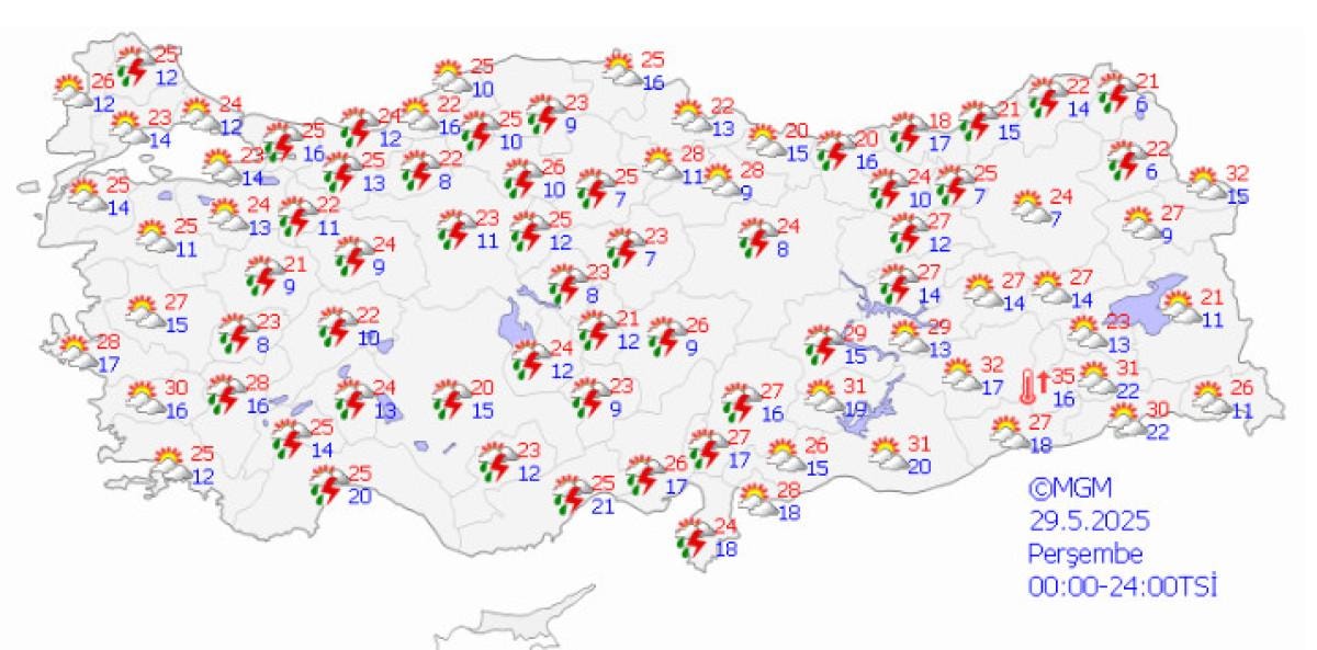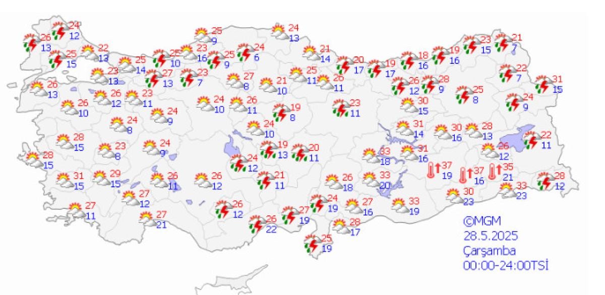 Meteoroloji Genel Müdürlüğü'nden alınan son bilgilere göre; 28 Mayıs 2025 tarihinde beklenen gök gürültülü sağanak yağışlar nedeniyle, 11 ilimiz için sarı uyarı verilmiştir.