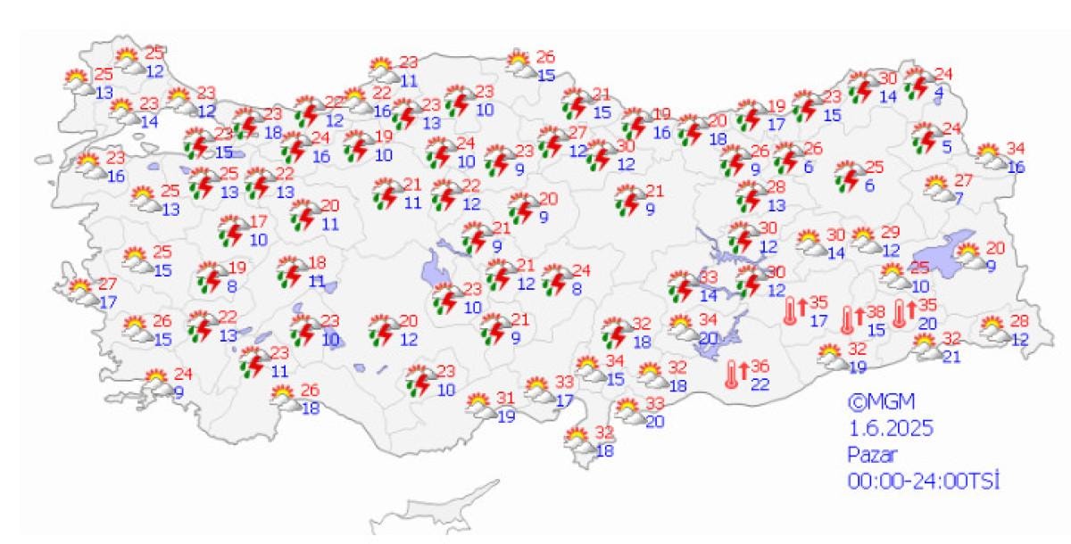 Adana ve Mersin illerinin kuzeyi, Osmaniye, Kahramanmaraş'ın kuzey ve batısı, Hatay'ın kuzey ilçeleri, Sivas'ın güneyi ve Malatya'nın kuzey ve batısında yerel olarak kuvvetli sağanak ve gök gürültülü sağanak yağış beklenmektedir.