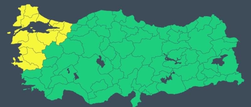 İstanbul, Balıkesir, Bilecik, Bursa, Çanakkale, Edirne, İzmir, Kırklareli, Kocaeli, Manisa, Sakarya, Tekirdağ, Yalova için sarı kodlu fırtına uyarısı yapıldı.