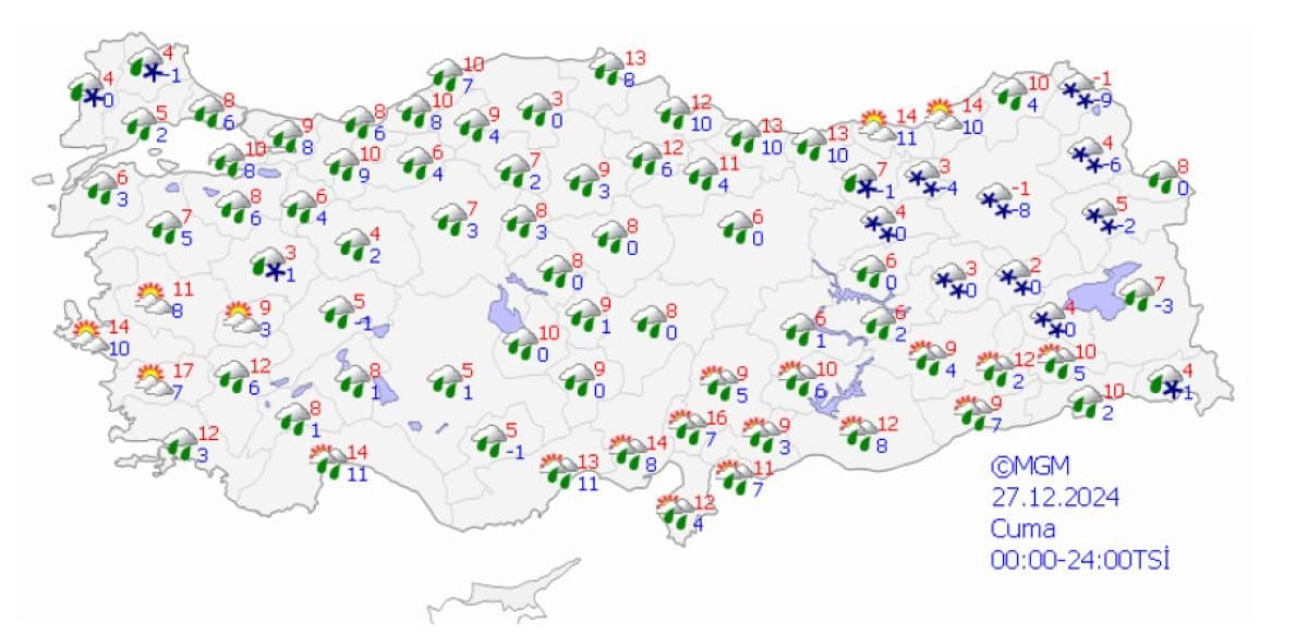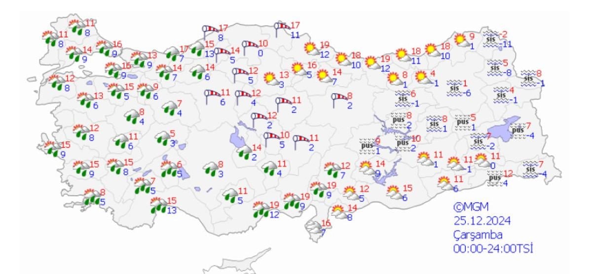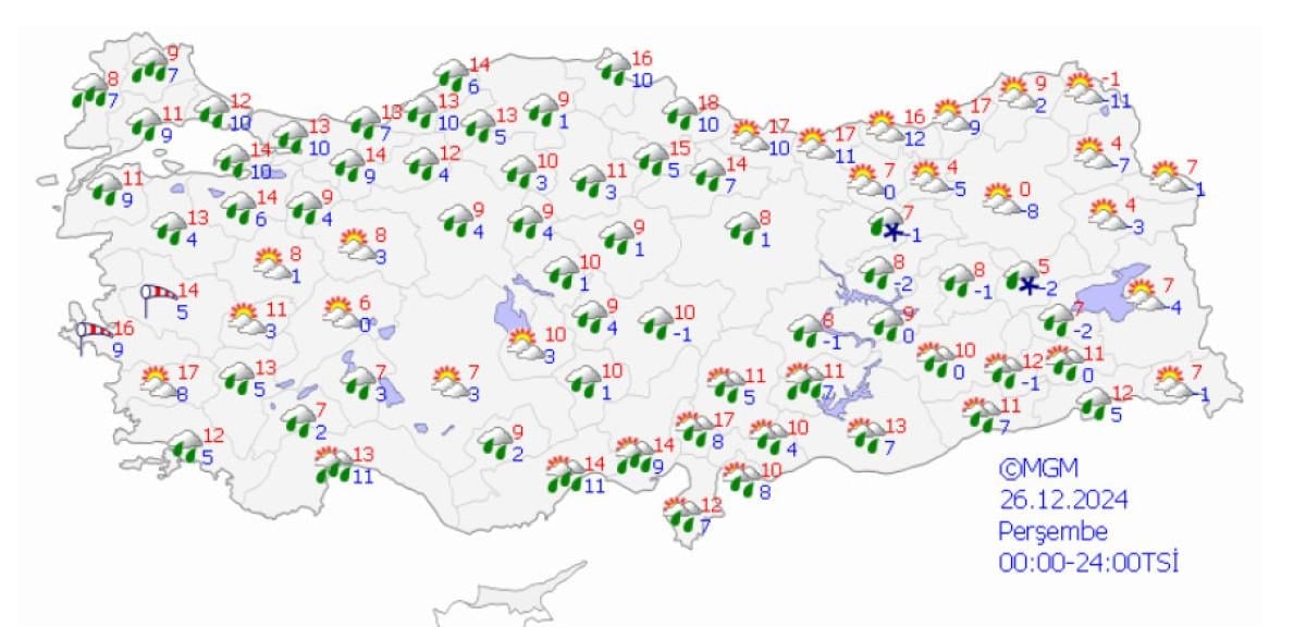 Meteoroloji Genel Müdürlüğü'nden alınan son bilgi ve yapılan değerlendirmelere göre; 24 Aralık Salı günü sabah saatlerinden itibaren Antalya'nın batı ve merkez ilçelerinde, öğle saatlerinden itibaren doğu ilçelerinde genellikle çok kuvvetli ve şiddetli; Kaş, Demre, Finike, Aksu, Serik, İbradı, Manavgat ve Alanya ilçelerinde şiddetli, yer yer aşırı şiddetli sağanak beklendiği belirtildi.