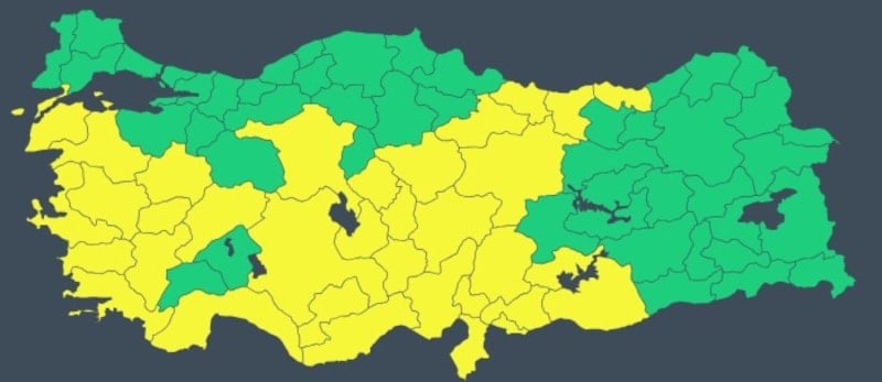 Sarı kodla uyarılan iller arasında ise, Adana, Adıyaman, Afyonkarahisar, Ankara, Antalya, Aydın, Balıkesir, Çanakkale, Denizli, Gaziantep, Giresun, Hatay, Mersin, İzmir, Kayseri, Kırşehir, Konya, Kütahya, Manisa, K.Maraş, Muğla, Nevşehir, Niğde, Ordu, Sivas, Tokat, Trabzon, Şanlıurfa, Uşak, Yozgat, Aksaray, Karaman, Kilis, Osmaniye yer aldı.