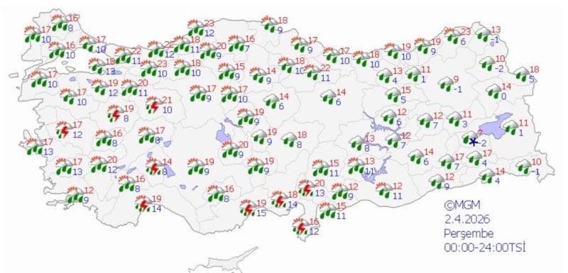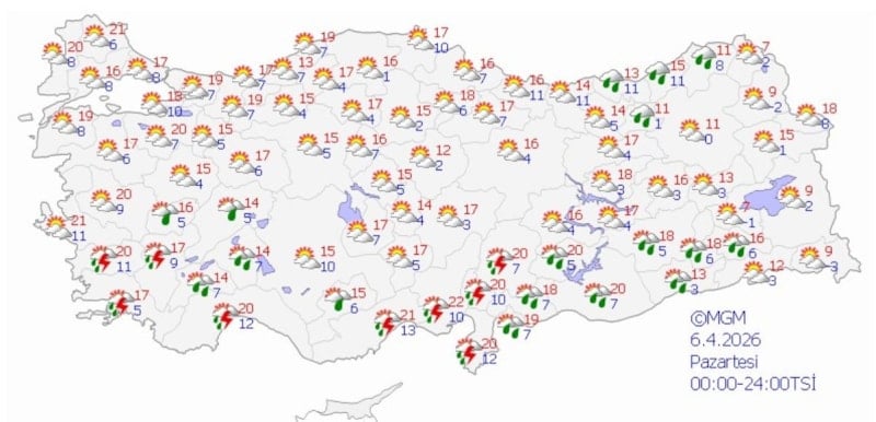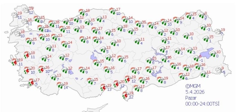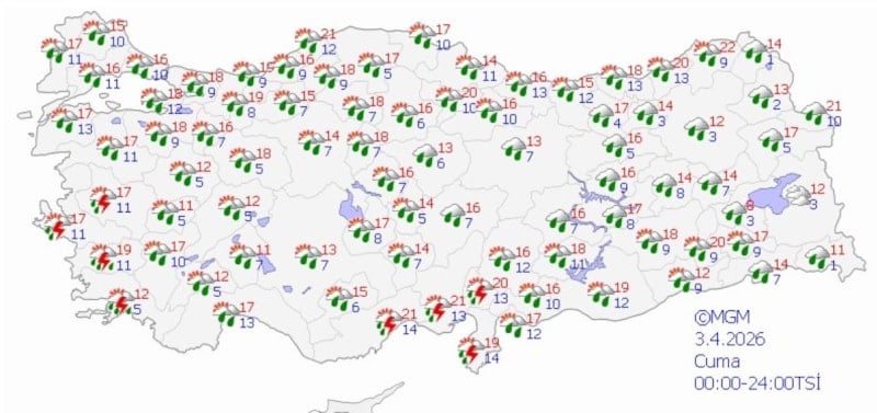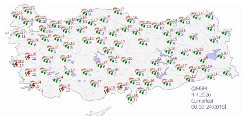 Gaziantep, Kilis, Adıyaman ve Şanlıurfa çevrelerinde yerel kuvvetli sağanak, Balıkesir'in batısı ve Çanakkale'de aralıklı ve yerel kuvvetli sağanak ve gök gürültülü sağanak bekleniyor.