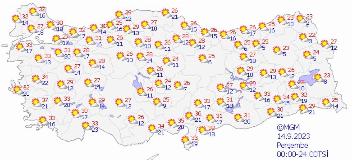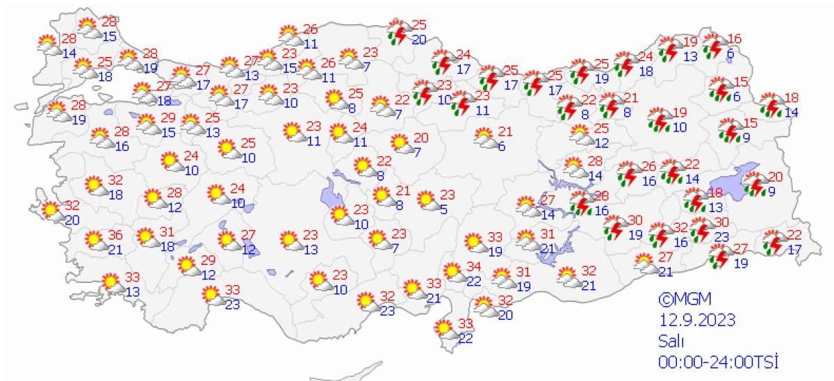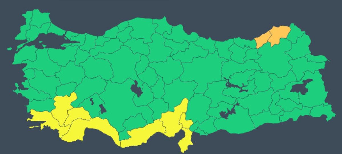 Yayınlanan son uyarı haritasına göre Muğla,Denizli, Burdur, Antalya, Mersin, Adana, Osmaniye, Hatay sarı kod, Rize ve Artvin ise turuncu kod ile uyarıldı.