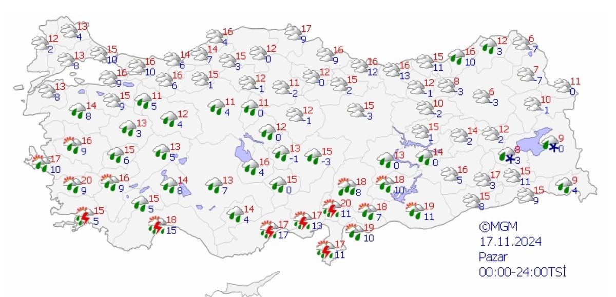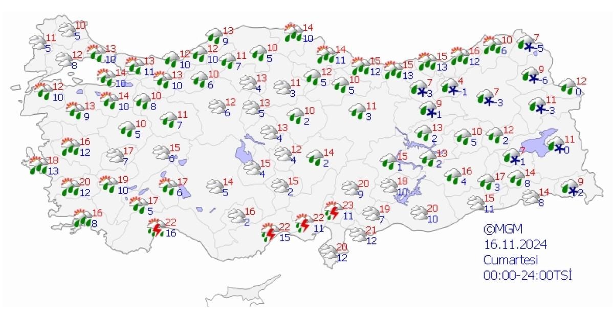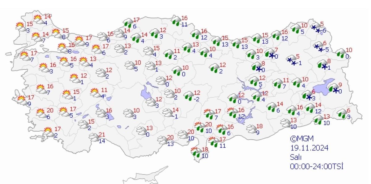 Meteoroloji tarafından yapılan son tahminlere göre; ülkemizin parçalı ve çok bulutlu, Marmara bölge geneli, Ege'nin kuzey ve batı, İç Anadolu'nun kuzey ve doğu, Batı Akdeniz'in kıyı, Doğu Akdeniz'in İskenderun Körfezi ve Toroslar kesimleri ile (Çorum hariç) Karadeniz ve (Şırnak hariç) Doğu Anadolu Bölgelerinin yağışlı geçeceği tahmin ediliyor.