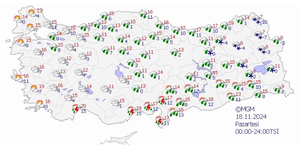 Yağışların, kıyı kesimlerde sağanak ve yer yer gök gürültülü sağanak, iç kesimlerde yağmur, Doğu Karadeniz ve Doğu Anadolu'nun yükseklerinde karla karışık yağmur ve (2200 metre üzerinde) yer yer kar şeklinde görülmesi bekleniyor.