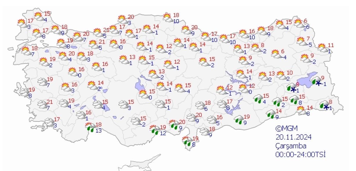 Hava sıcaklıklarının bugün Akdeniz kıyı kesimleri dışında kalan yerlerde 2 ila 4 derece azalması, Akdeniz kıyılarında önemli bir değişiklik olmaması beklenmektedir.