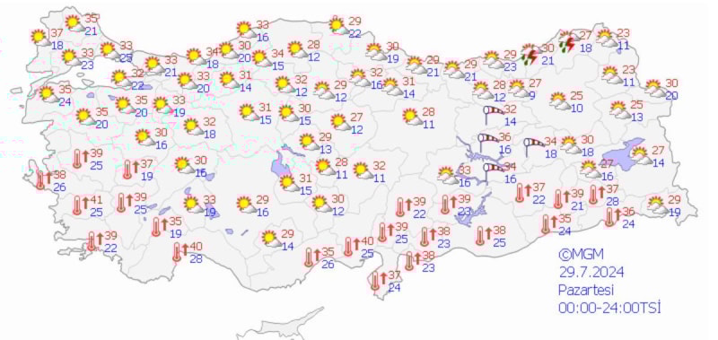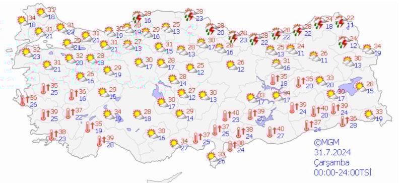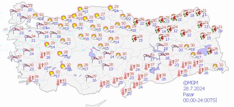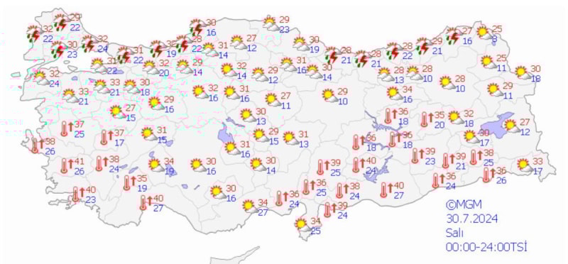 Marmara'nın doğusu, Doğu Akdeniz, İç Anadolu'nun kuzeydoğusu, Karadeniz, Doğu Anadolu'nun kuzeyi ile Ankara, Kayseri, Niğde ve Nevşehir çevrelerinde yerel sağanak ve gök gürültülü sağanak yağışlar görüleceği tahmin ediliyor.