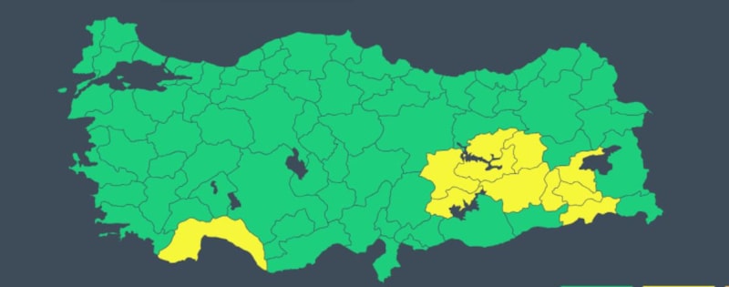 Adıyaman, Antalya, Bingöl, Bitlis, Diyarbakır, Elazığ, Malatya, Siirt, Tunceli, Batman, Şırnak için sarı kodlu uyarı yapıldı.