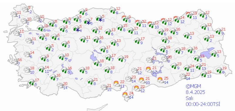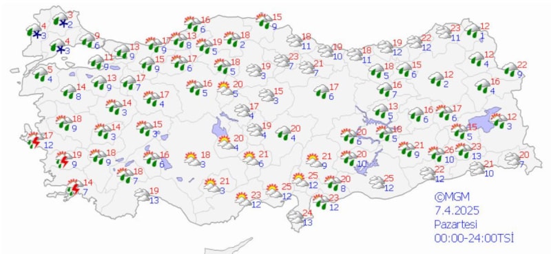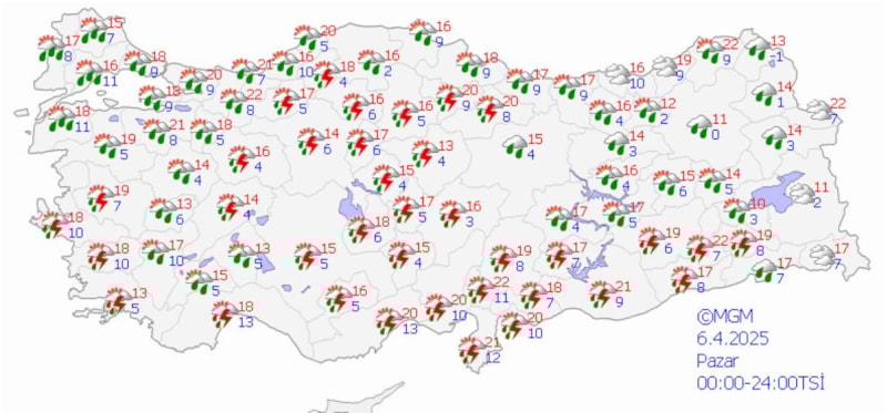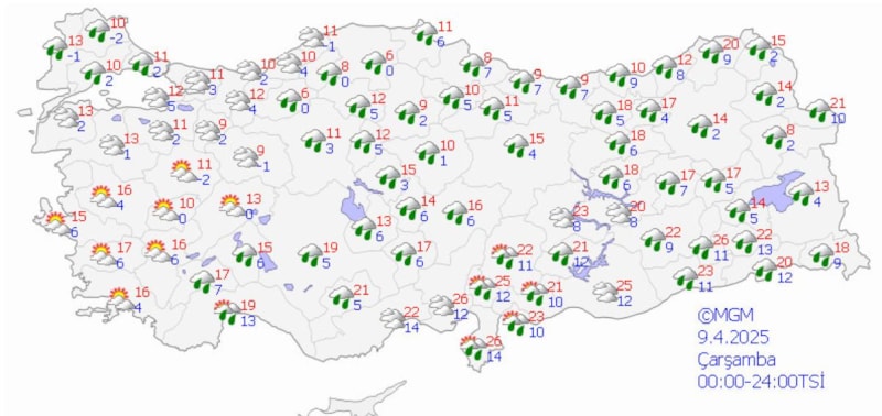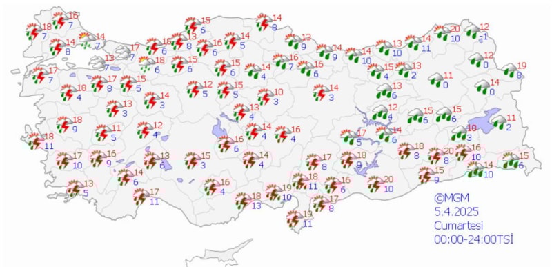 Yağışların genellikle yağmur ve sağanak, güney, iç ve batı kesimlerde yer yer gök gürültü sağanak, Doğu Karadeniz’in iç kesimleri ile Doğu Anadolu’nun kuzeydoğusunun yüksek kesimlerinde karla karışık yağmur ve kar şeklinde görülmesi beklenen yağışların Doğu Anadolu'nun batısı ile Antalya’nın doğusu, Mersin, Adana, Kahramanmaraş, Osmaniye, Hatay kıyıları, Aksaray, Bitlis, Şırnak, Hakkari, Adıyaman ve Siirt çevrelerinde yer yer kuvvetli olması bekleniyor.