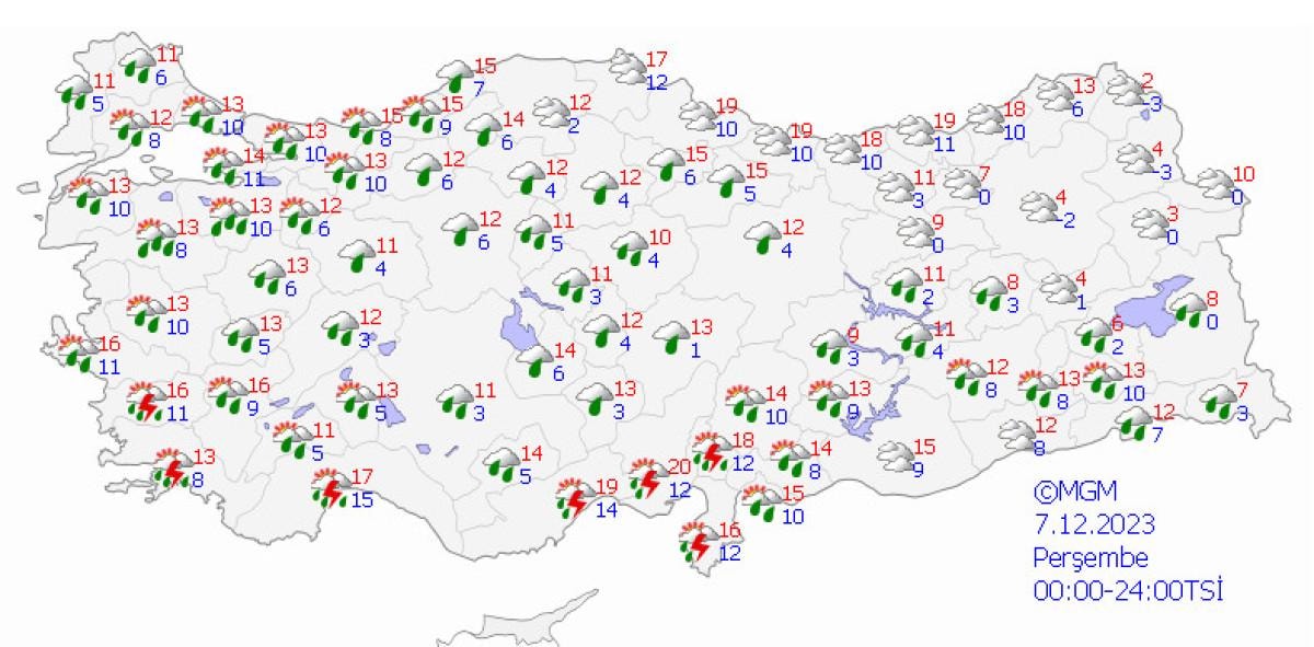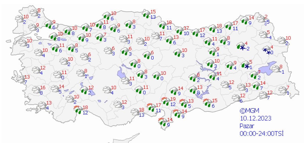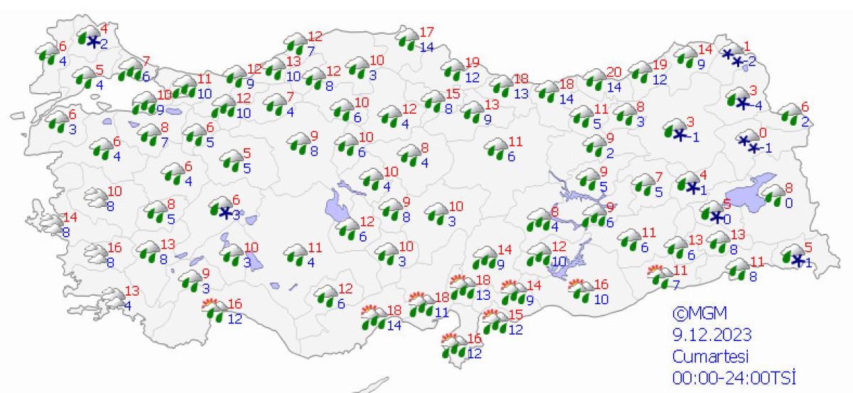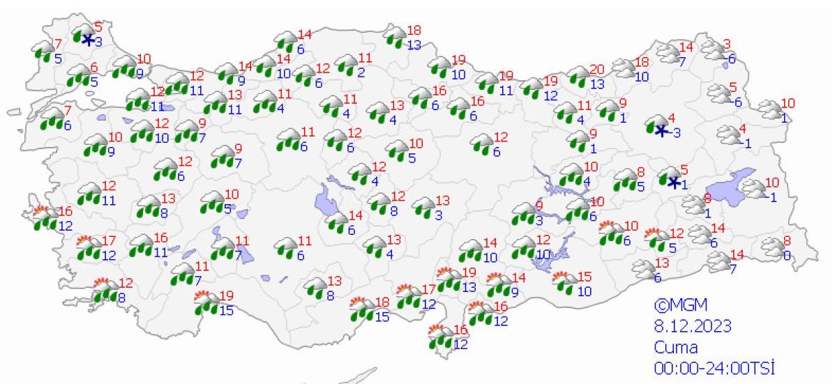Meteoroloji Genel Müdürlüğü tarafından yapılan son değerlendirmeye göre; ülkemiz genelinin parçalı ve çok bulutlu, Marmara, Ege, Akdeniz, İç Anadolu'nun kuzey ve doğusu, Batı Karadeniz'in batısı, Orta Karadeniz'in iç kesimleri, Doğu Karadeniz'in doğusu, (Erzincan hariç) Doğu Anadolu , (Ş.Urfa hariç) Güneydoğu Anadolu'nun yağışlı geçeceği tahmin ediliyor.