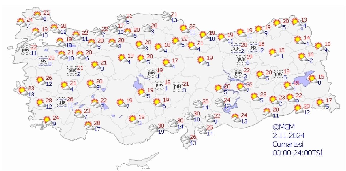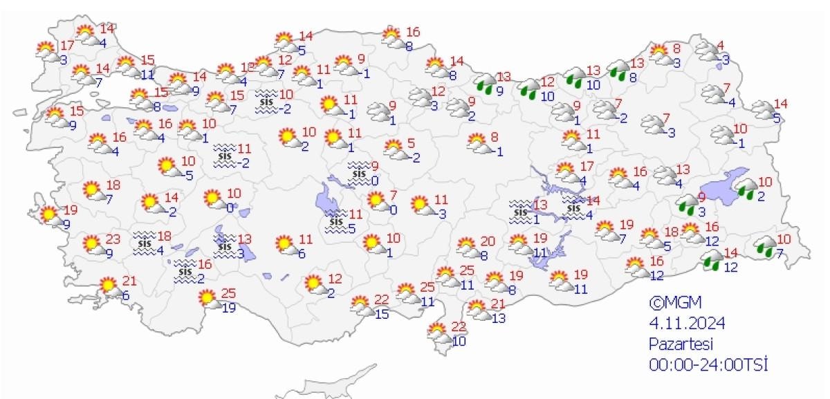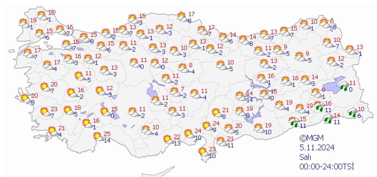 “Bugün batı Karadeniz ile Sakarya, Samsun, Gaziantep çevrelerinin yağmurlu, diğer yerler az bulutlu. Kuzey ve iç kesimler sisli. Sıcaklık ortalamada İstanbul 19, Ankara 17C.