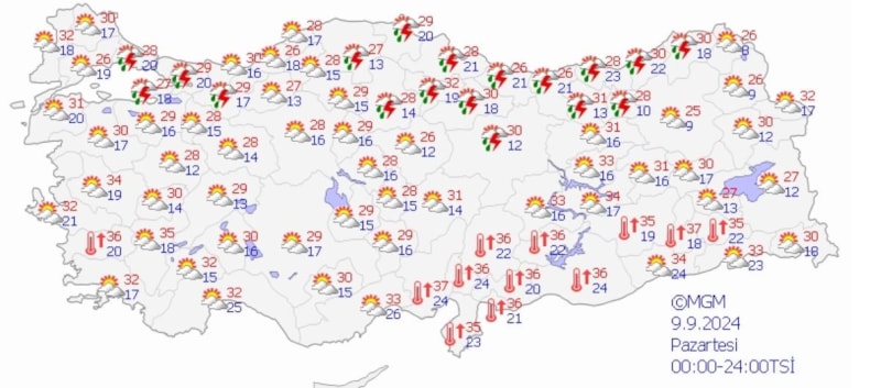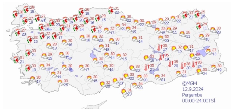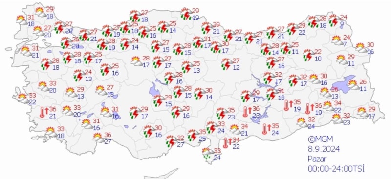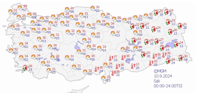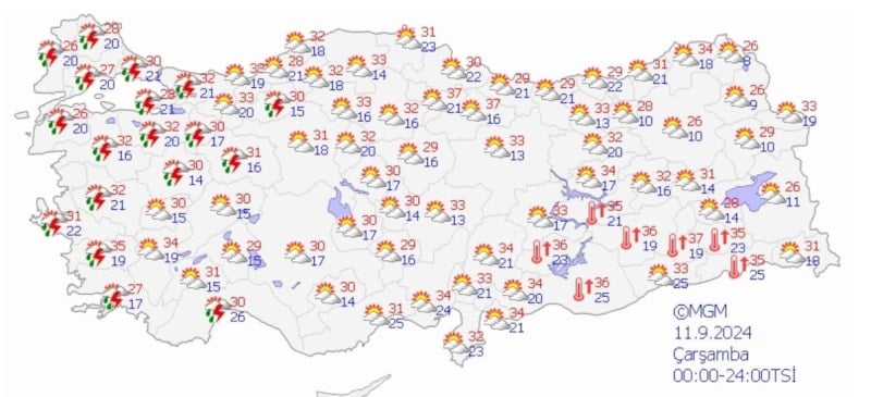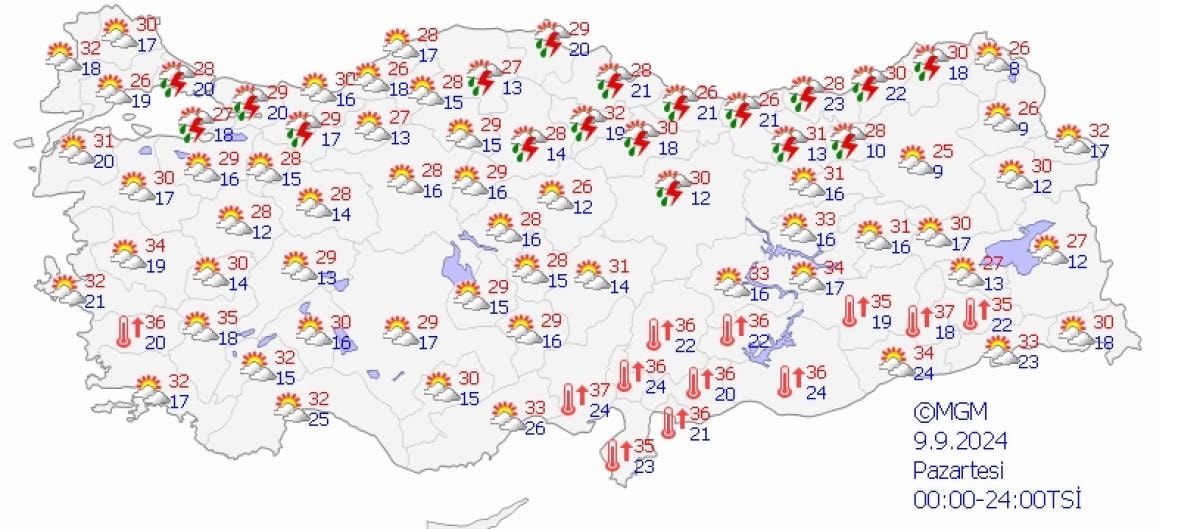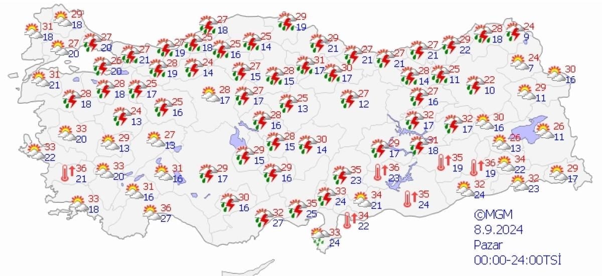 Marmara'nın kuzey ve doğusuyla İç Ege'nin kuzeyi, Isparta hariç Batı Akdeniz'in iç kesimleri, Doğu Akdeniz, İç Anadolu'nun kuzey ve doğusu, Karadeniz ve Doğu Anadolu’nun kuzey ve batısında yerel sağanak ve gök gürültülü sağanak yağışlar bekleniyor.