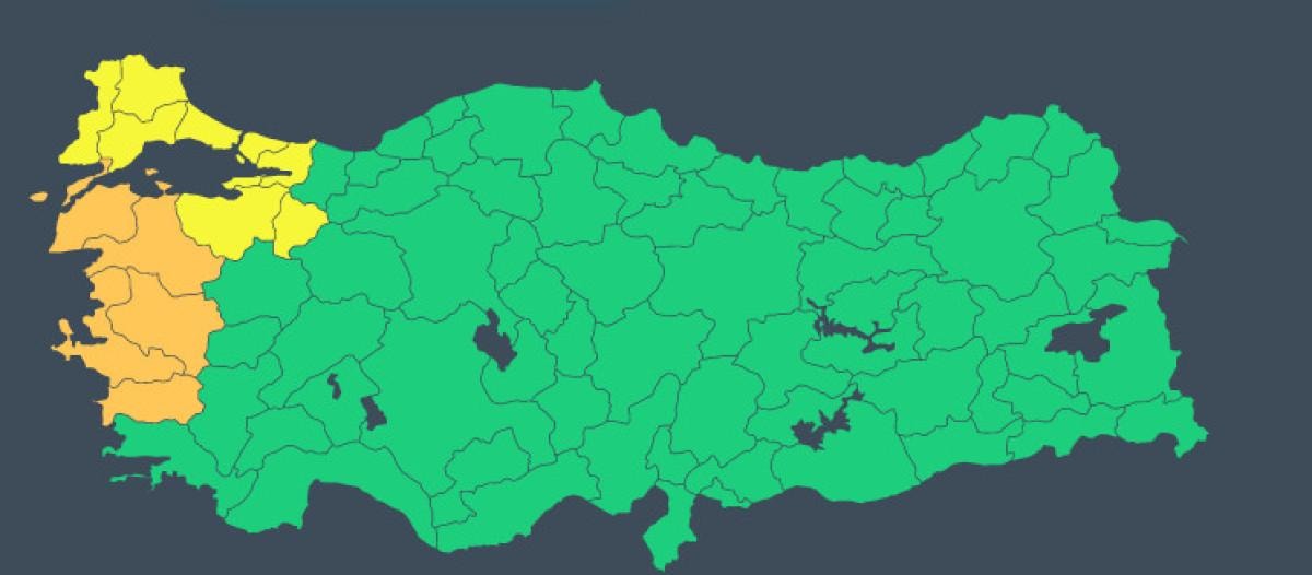 MGM'nin sitesinde yer alan uyarı haritasına göre Bilecik, Bursa, Kocaeli, İstanbul, Yalova, Tekirdağ, Kırklareli, Edirne sarı kodla uyarılırken, Balıkesir, Çanakkale, İzmir, Manisa ve Aydın'a ise turuncu uyarı verildi.