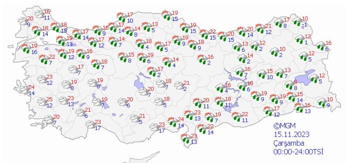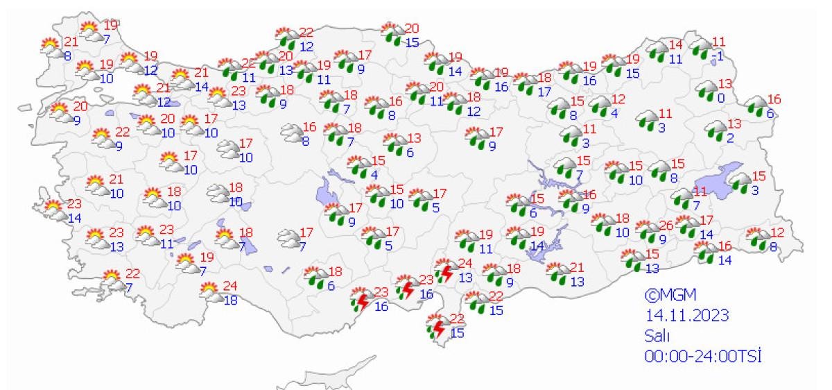 Yağışın başlangıç saati olarak 11.11.2023 13.00, bitiş vaktinin de 11.11.2023 23.50 olarak tahmin edildiği ifade edildi.