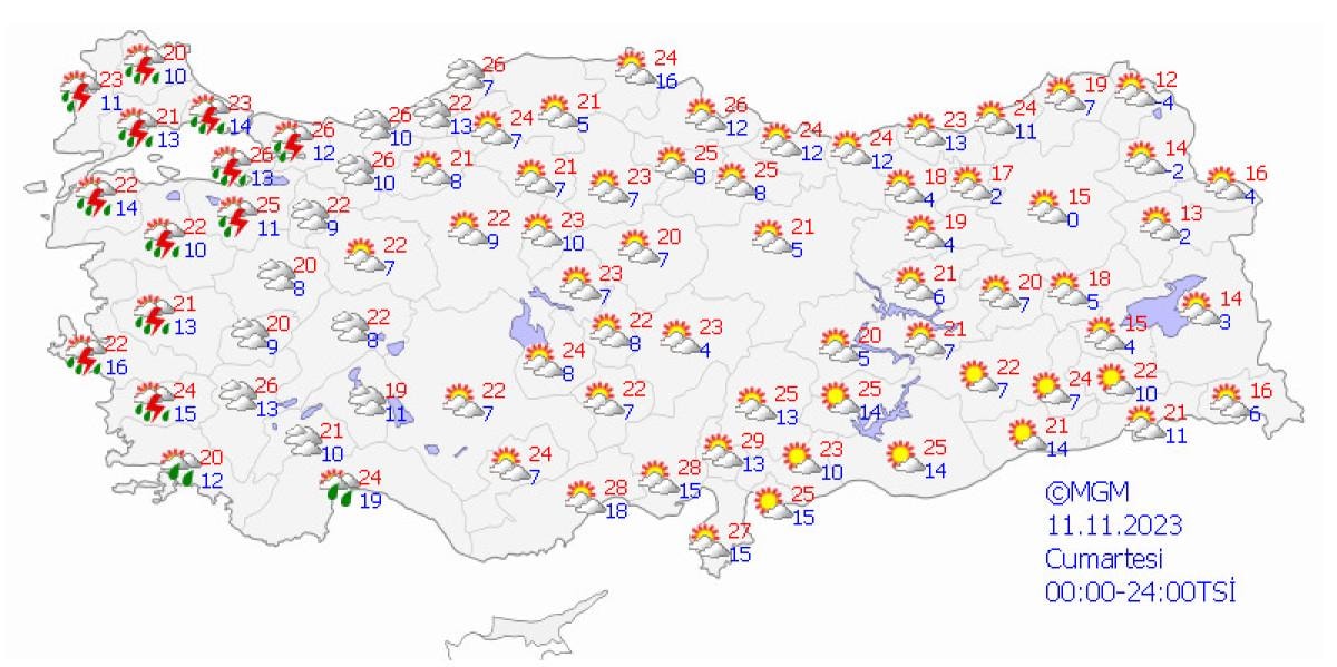 Meteoroloji Genel Müdürlüğü'nden yapılan uyarıda, "11 Kasım Cumartesi günü öğleden sonra Kırklareli ve Tekirdağ'da akşam saatlerinden itibaren İstanbul'da yerel olarak kuvvetli (21-50 kg/m2) sağanak ve gök gürültülü sağanak yağış beklendiğinden sel, su baskını, yıldırım, ulaşımda aksamalar, yerel oldu yağışı, yağış anında kuvvetli rüzgar gibi olumsuzluklara karşı dikkatli ve tedbirli olunmalıdır." ifadeleri yer aldı.