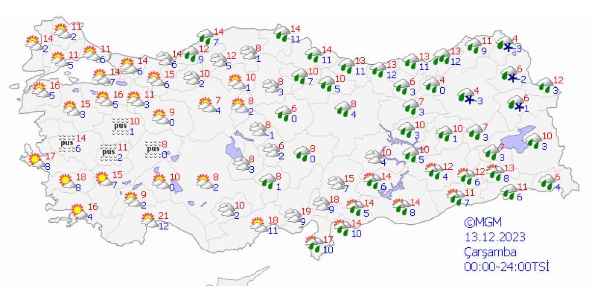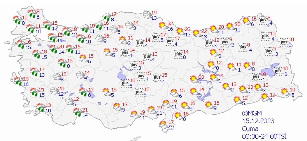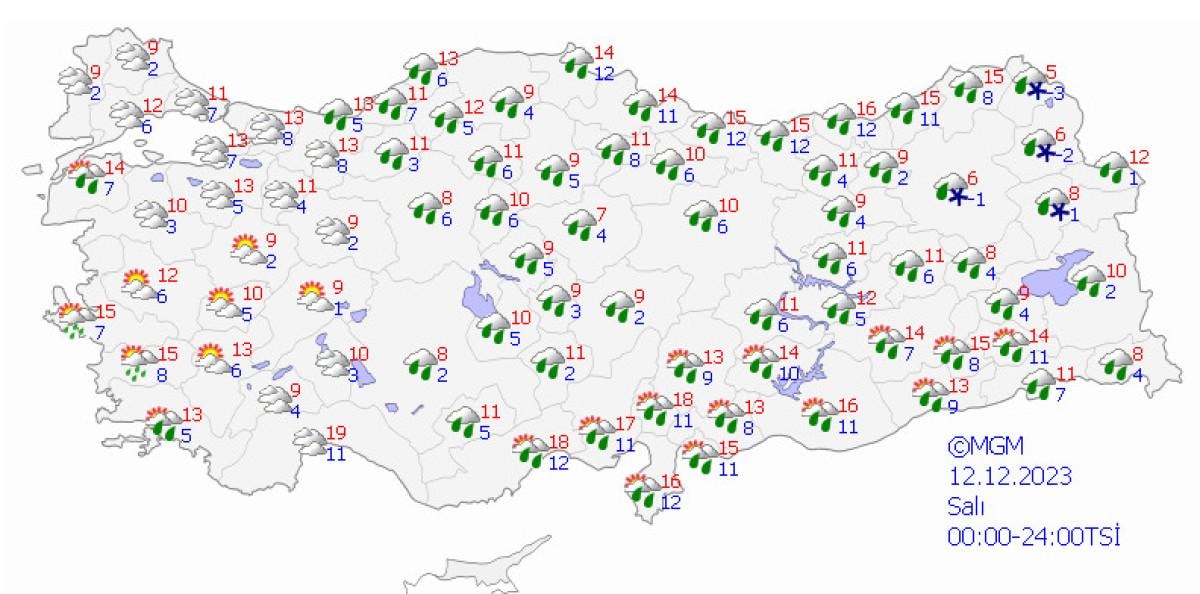 Yapılan son değerlendirmelere göre; yurt genelinin parçalı ve çok bulutlu, Güney Ege, Akdeniz, İç Anadolu (Eskişehir hariç), Batı Karadeniz'in doğusu, Orta ve Doğu Karadeniz (Rize ve Artvin hariç) Doğu Anadolu (Van hariç), Güneydoğu Anadolu ile Afyonkarahisar ve Uşak çevrelerinin yağışlı geçeceği tahmin ediliyor.