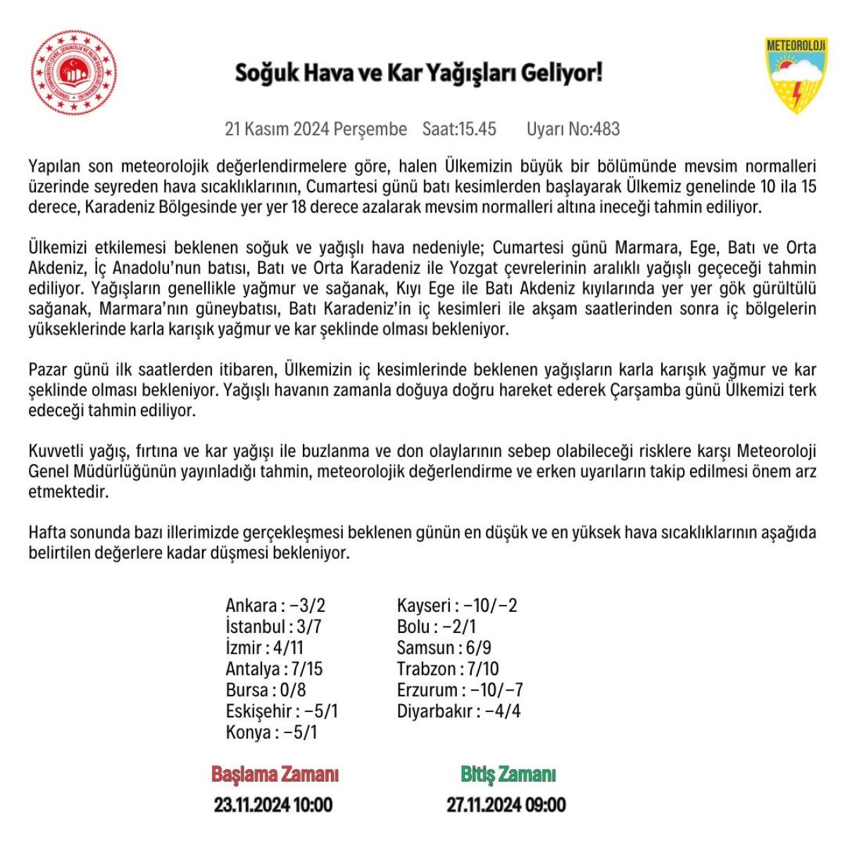 Yurt genelinde mevsim normalleri üzerinde seyreden hava sıcaklıklarının, cumartesi günü akşam saatlerinden itibaren 14-18 derece azalarak mevsim normalleri altına ineceğinin tahmin edildiği belirtildi.