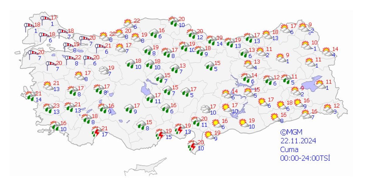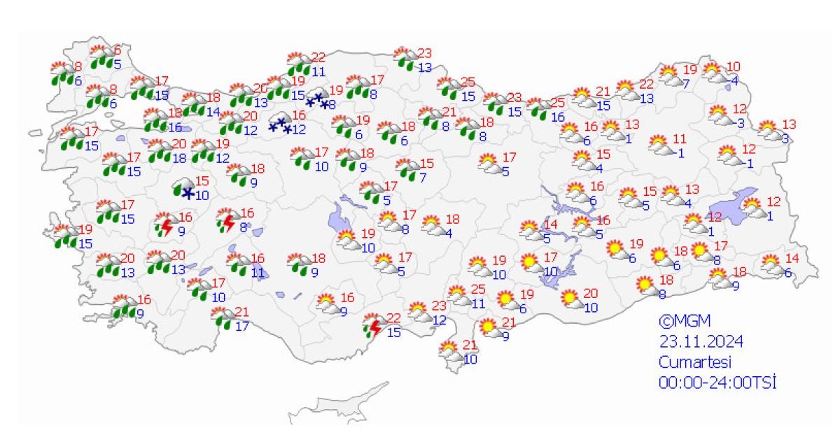 Yağışların genellikle yağmur ve sağanak, Kıyı Ege ile Batı Akdeniz kıyılarında yer yer gök gürültülü sağanak, Marmara'nın güneybatısı, Batı Karadeniz'in iç kesimleri ile akşam saatlerinden sonra iç bölgelerin yükseklerinde karla karışık yağmur ve kar şeklinde olması bekleniyor..