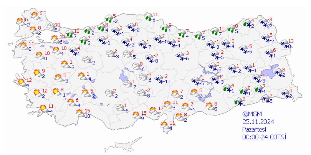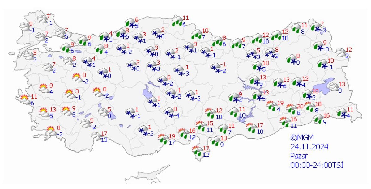Pazar günü ilk saatlerden itibaren, ülkemizin iç kesimlerinde beklenen yağışların karla karışık yağmur ve kar şeklinde olması bekleniyor. Yağışlı havanın zamanla doğuya hareket ederek Çarşamba günü ülkemizi terk edeceği tahmin ediliyor.