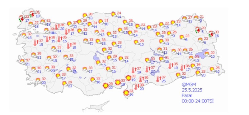 İzmir'de ise cuma ve cumartesi günleri açık havanın etkili olacağını belirten Tekin, "Hava sıcaklığı 32 ila 34 derece arasında olacak. Pazar günü İzmir'de 37 dereceye kadar çıkacak. Pazarı pazartesiye bağlayan gece saatlerinde ise hem kuvvetli lodos hem de yer yer sağanak ve gök gürültülü sağanaklar bekliyoruz." dedi.