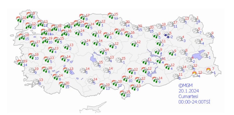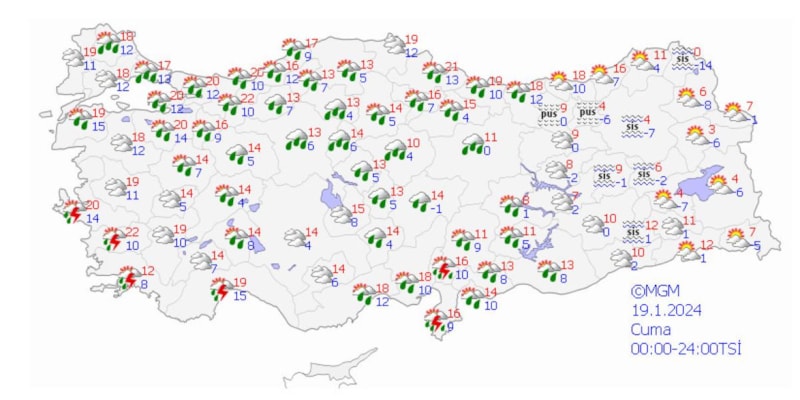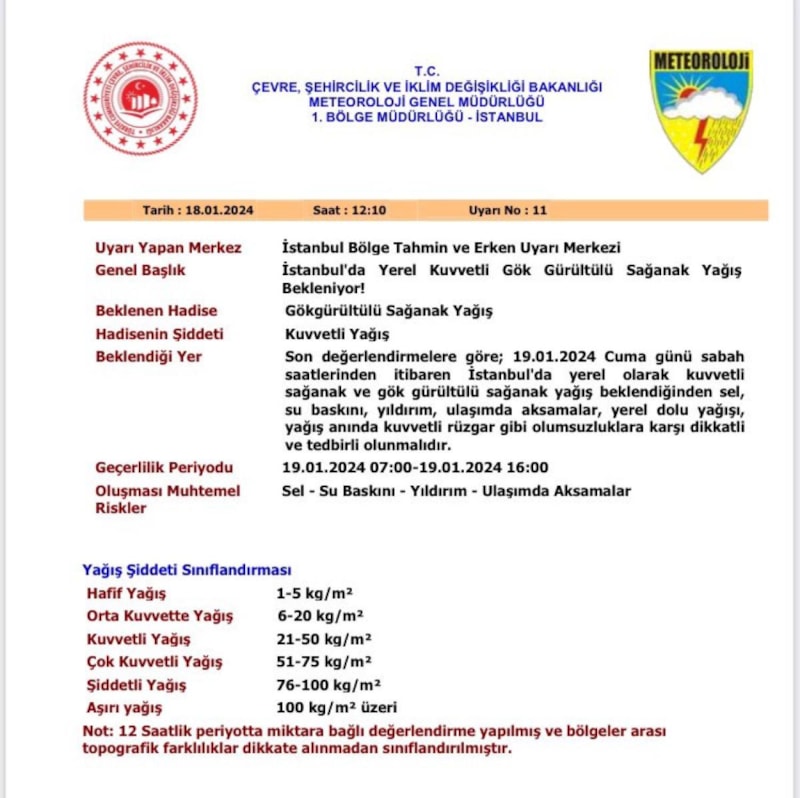 İstanbul’da 19.01.2024 Cuma günü sabah saatlerinden itibaren yerel olarak kuvvetli sağanak ve gök gürültülü sağanak yağış beklenmektedir.