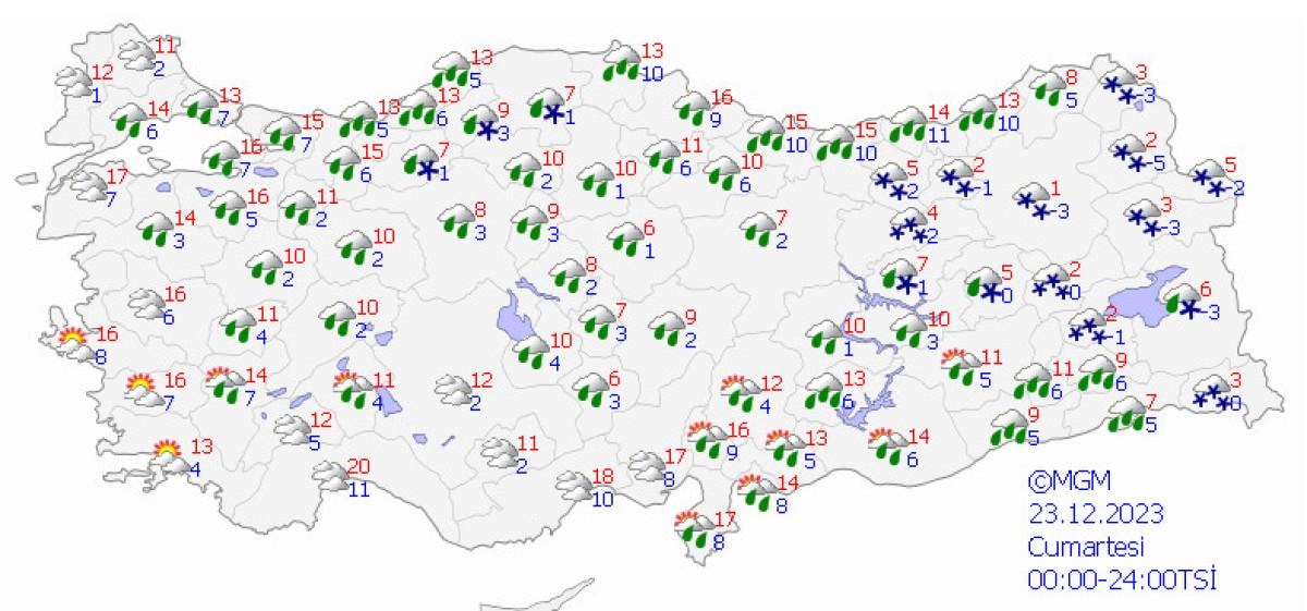 “Batı Karadeniz’de rüzgarın 22 Aralık Cumartesi günü ilk saatlerde doğusunda, öğle saatlerinden itibaren genelinde batı ve güneybatı, zamanla kuzeybatı yönlerinden 7-9 kuvvetlerinde (50-90 km/sa) kuvvetli fırtına, yer yer 10 kuvvetle (105 km/sa) tam fırtına şeklinde eseceği tahmin ediliyor. Fırtınanın 23 Aralık Pazar günü sabah saatlerinde etkisini kaybetmesi bekleniyor”