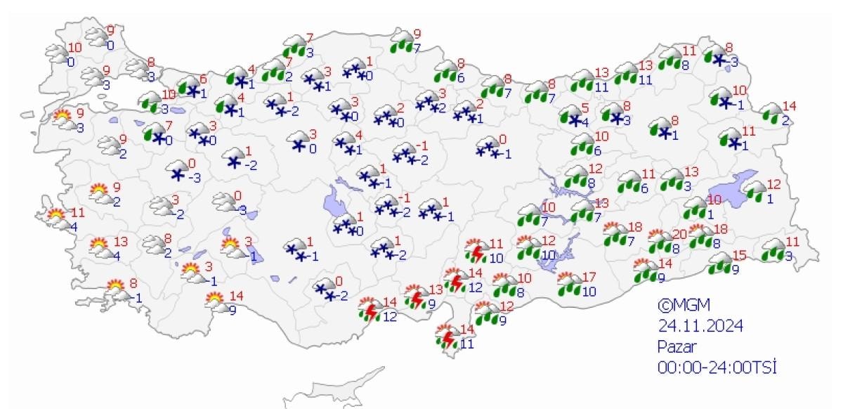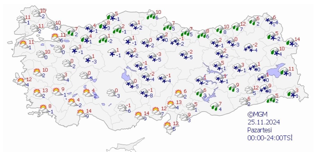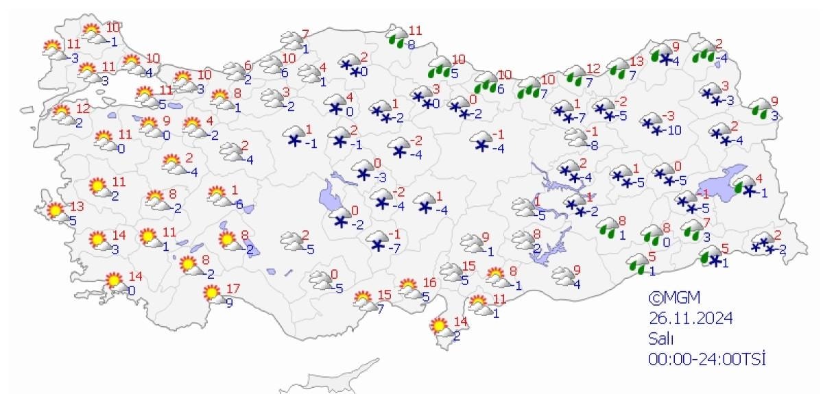 Parçalı ve çok bulutlu, yarın (Pazar) sabah ve öğle saatlerinde yağmur ve sağanak yağışlı, zamanla karla karışık yağmur ve kar yağışlı geçeceği tahmin ediliyor. Yağışların, yarın (Pazar) sabah ve öğle saatlerinde yer yer kuvvetli olması bekleniyor.