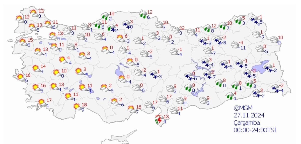 Parçalı ve çok bulutlu, yağmur ve sağanak, kıyı kesimlerinin yer yer gök gürültülü sağanak yağışlı, Doğu Akdeniz'in yüksek kesimlerinin karla karışık yağmur ve kar yağışlı geçeceği tahmin ediliyor.