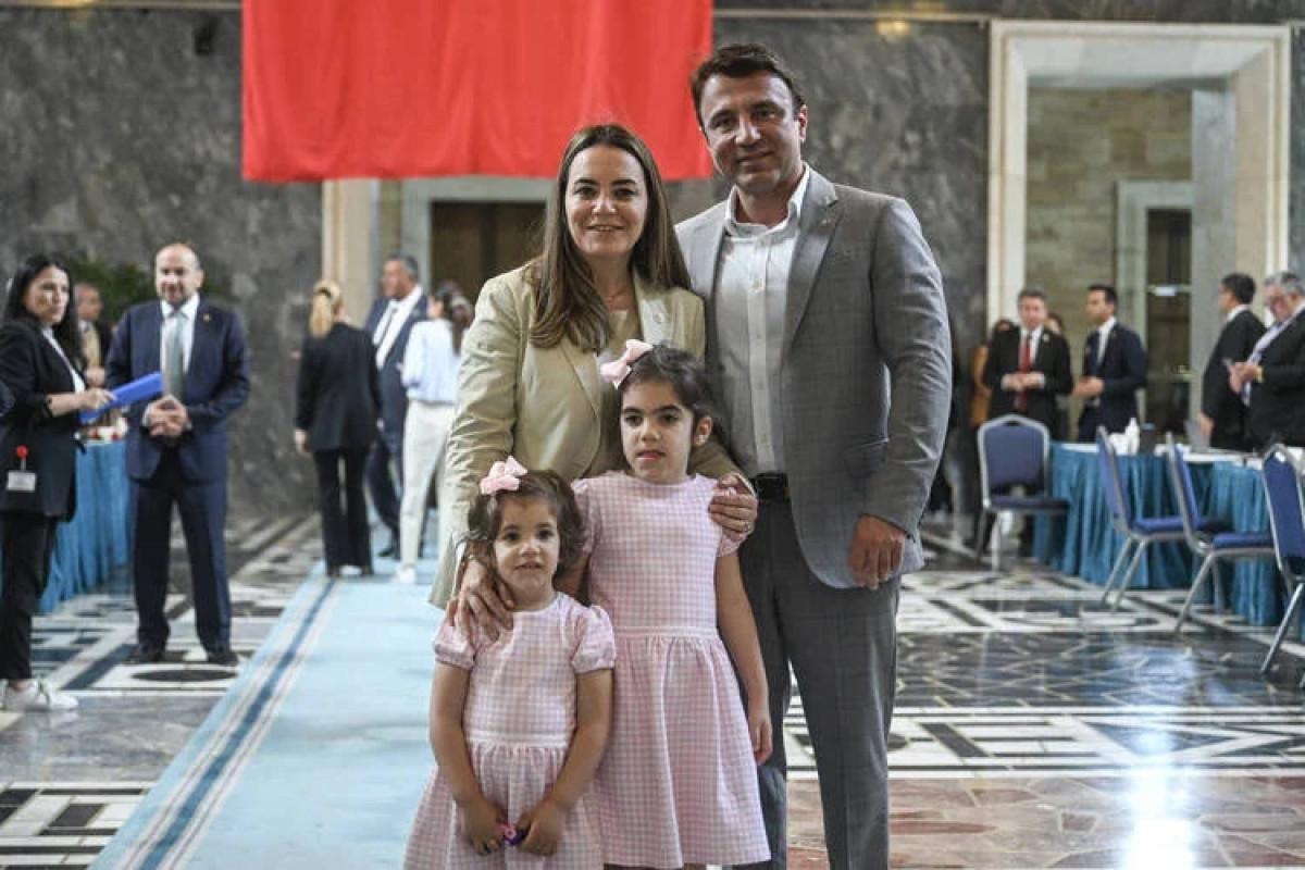 Yıldırım'a milletvekili rozetini, kendisine eşlik eden torunları 6 yaşındaki Ömer Mete ile 2 yaşındaki Baturalp Yıldırım taktı.