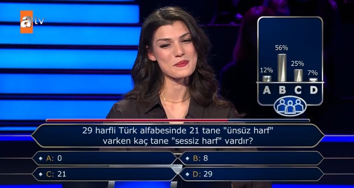 "29 harfli Türk alfabesinde 21 tane 'ünsüz harf' varken kaç tane 'sessiz harf' vardır?" sorusu karşısında emin olmak için seyirci jokerini kullanan yarışmacı, seyircinin 'B:8' demesi üzerine soruya cevap verdi.