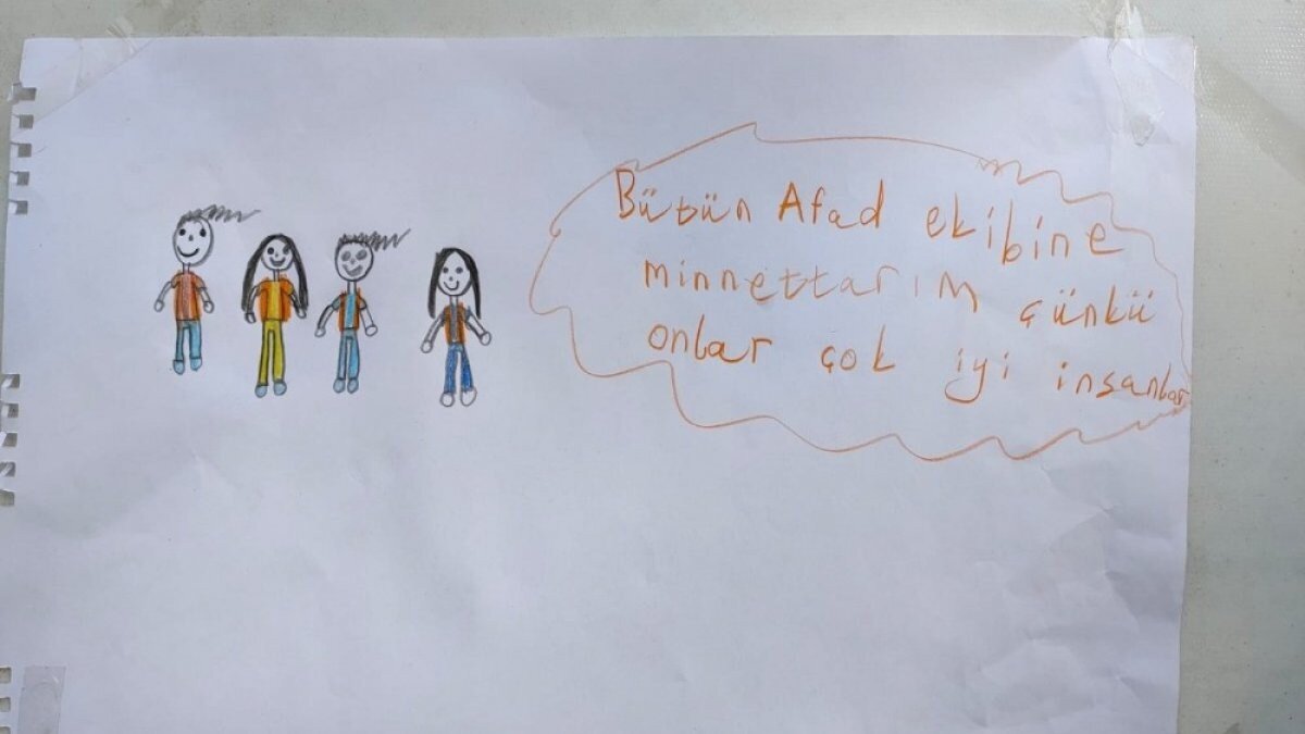 Yaşanan depremden sonra halen çadır kentte yaşayan minik kız, çadır kentte tüm ihtiyaçlarını gideren AFAD ekibine yaptığı çizim ve yazdığı notla teşekkür etti.