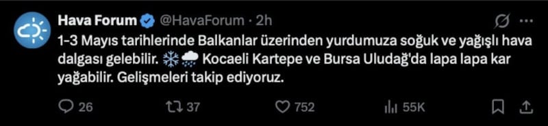 Meteoroloji kaynağı Hava Forum, 1-3 Mayıs tarihlerinde yurdumuza soğuk ve yağışlı hava dalgası geleceğini duyurdu.